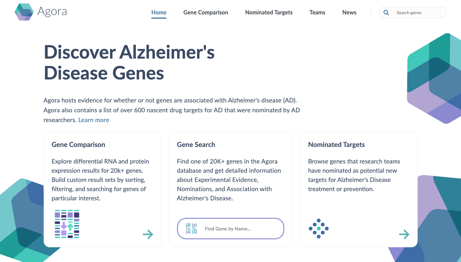 Agora is a web application that hosts high-dimensional human transcriptomic, proteomic, and metabolomic evidence for whether or not genes are associated with Alzheimer’s disease (AD). Agora also contains a list of over 900 nascent drug targets for AD that were nominated by AD researchers. The list of nominated targets was contributed by researchers from the National Institute on Aging's Accelerating Medicines Partnership in Alzheimer's Disease (AMP-AD) consortium and Target Enablement to Accelerate Therapy Development for Alzheimer's Disease (TREAT-AD) centers, as well as other research teams. Other evidence presented in Agora was either generated by AMP-AD and TREAT-AD research teams, or is aggregated from publicly available data sources.