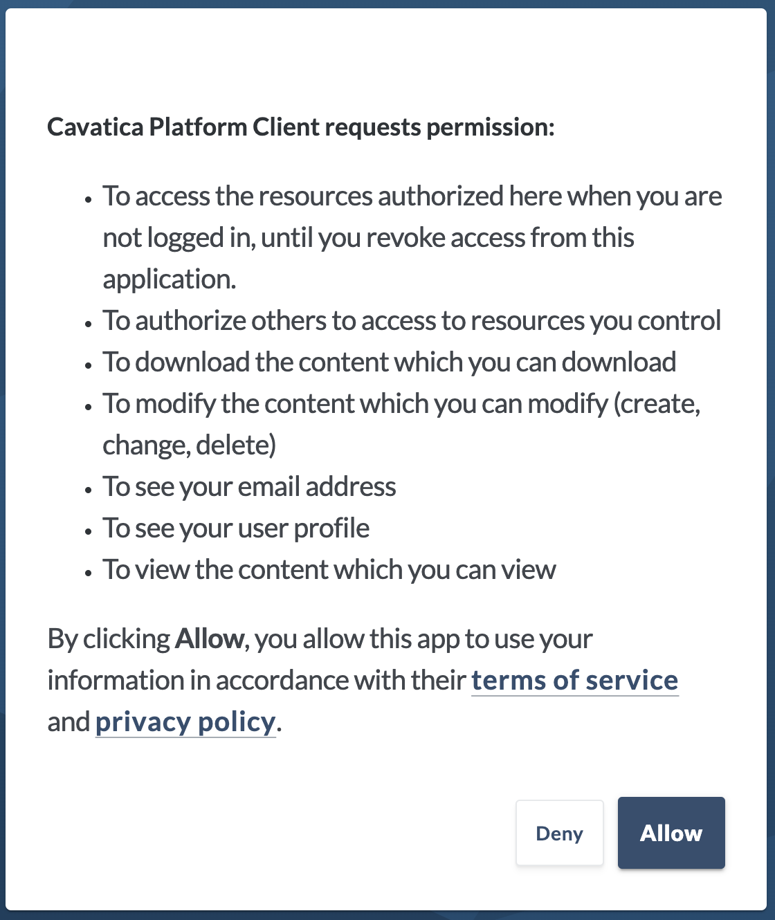 You will be redirected to sign in to Synapse. Log into Synapse and review the prompt requesting permission for CAVATICA to link with your Synapse account. Click Allow.