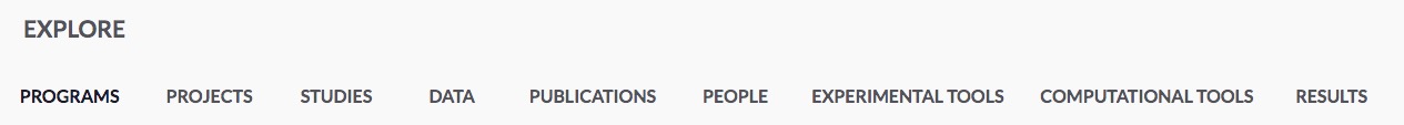 For example, the Programs page lists all programs, so you can find and select one of interest to visit that program’s specific page, which will list all of its associated projects and studies. The Projects or Studies page lists all projects/studies. All of these pages operate in the same way—access any one to view data based on that category.