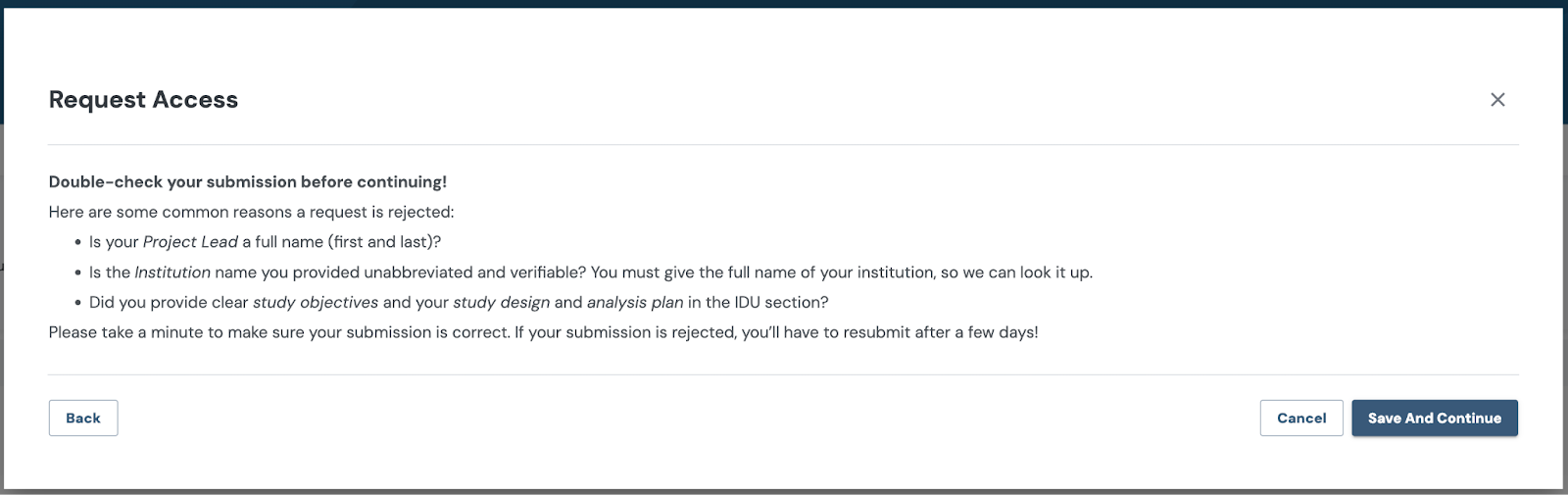 Verify the content in the request is accurate. If your intended data uses have changed, you must update them. If the studies you expect to access have changed, you must update the study list.