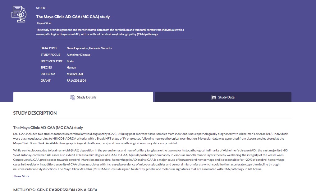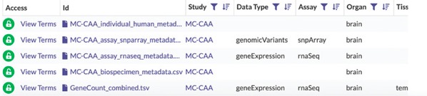 In this use case, we’ll demonstrate how to select and download processed genomic variant, RNA-seq, and associated annotation files from the Mayo Clinic AD Cerebral Amyloid Angiopathy study (MC-CAA), which was generated as part of the M2OVE-AD program.