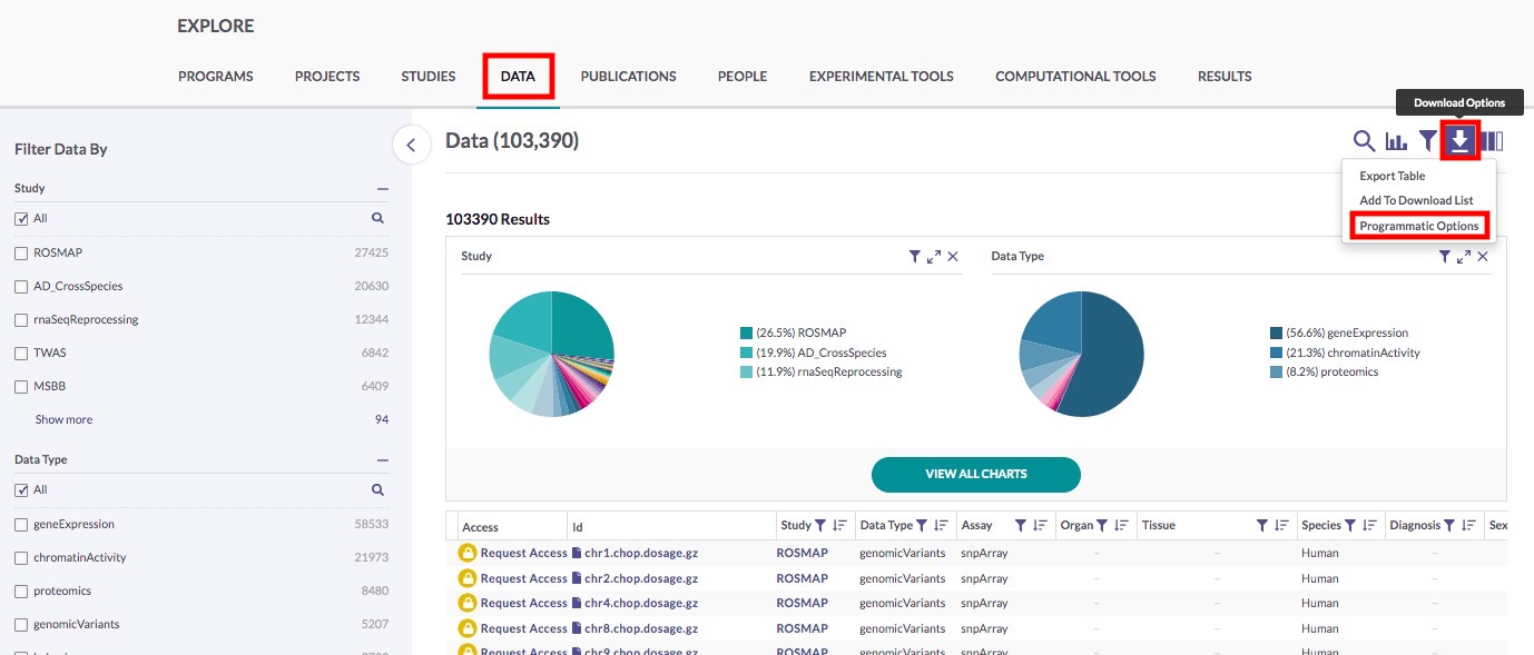 ⚠ If working on your personal computer, you may store your credentials locally by including the--rememberMeargument (shown below) to allow automatic authentication with future Synapse interactions. We recommend doing this to prevent accidentally sharing your password while sharing analytical code. In almost all cases, your Synapse API key is more secure than your password, and we recommend you use it to log in. Find your API key in your user profile—read more on that here.CODEsynapse login -u <Synapse username> -p <API key> --rememberMeIn the AD Knowledge Portal, click the Explore tab, followed by the Data subtab. Then, click the Download Options icon, followed by Programmatic Options from the dropdown menu.